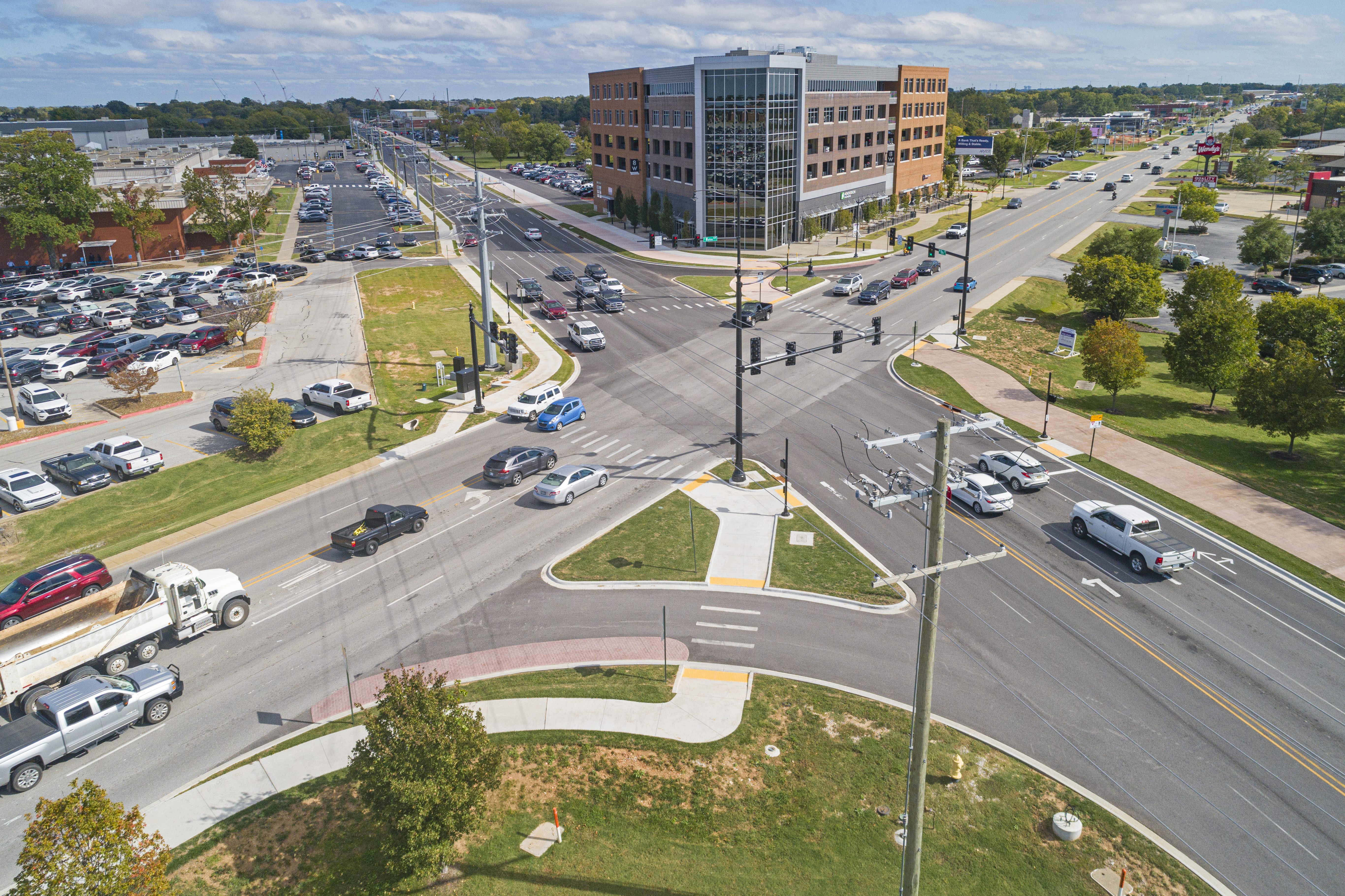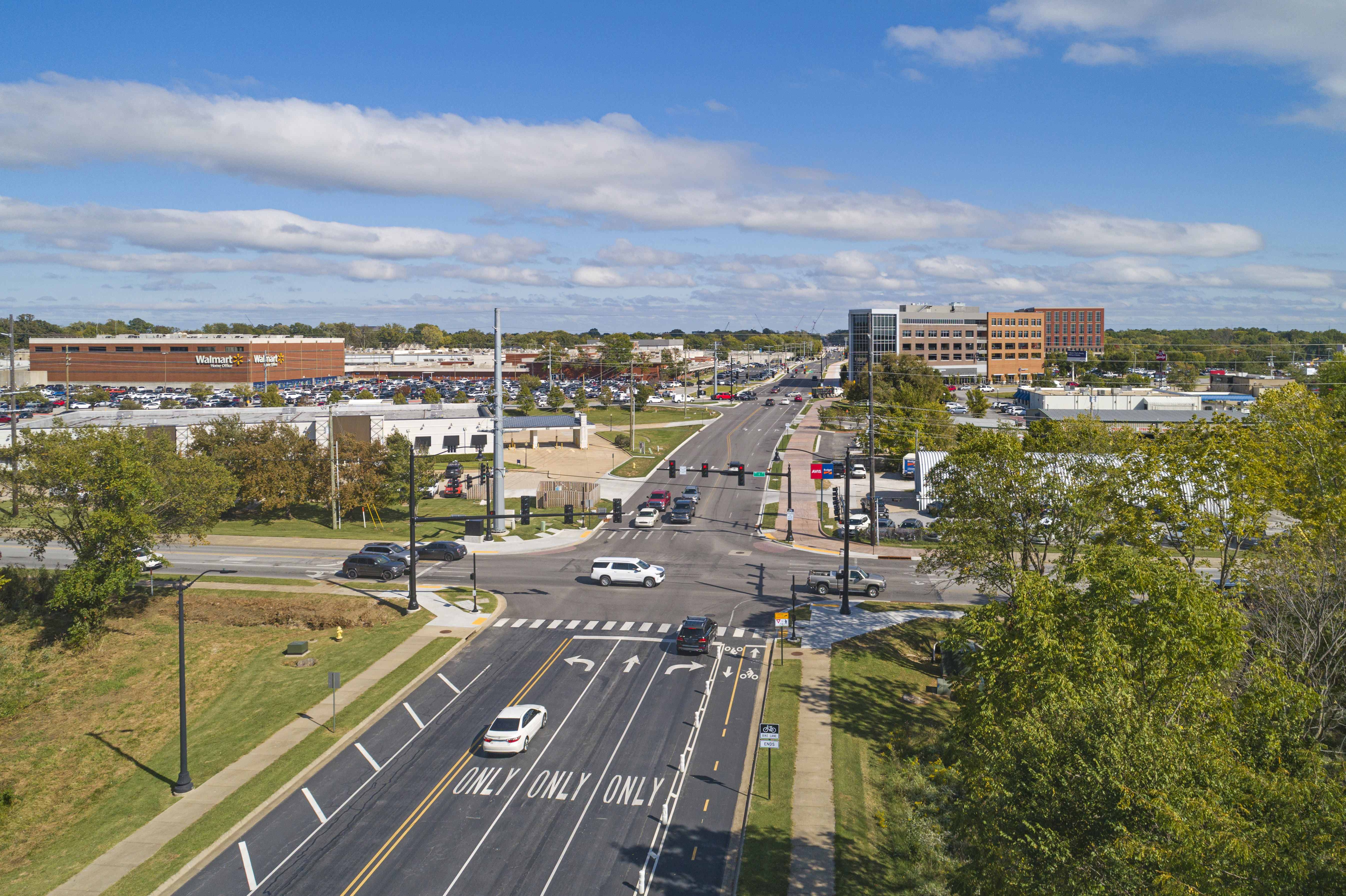 This roadway is a vital area to the Bentonville community, supporting commercial, residential and mixed uses. It also forms the southern boundary of the downtown district along part of the corridor and is adjacent to both the existing Walmart headquarters, as well as the newly constructed headquarters. All work was approved by Arkansas Department of Transportation and conformed to Federal Highway Administration requirements due to various federal funding sources.