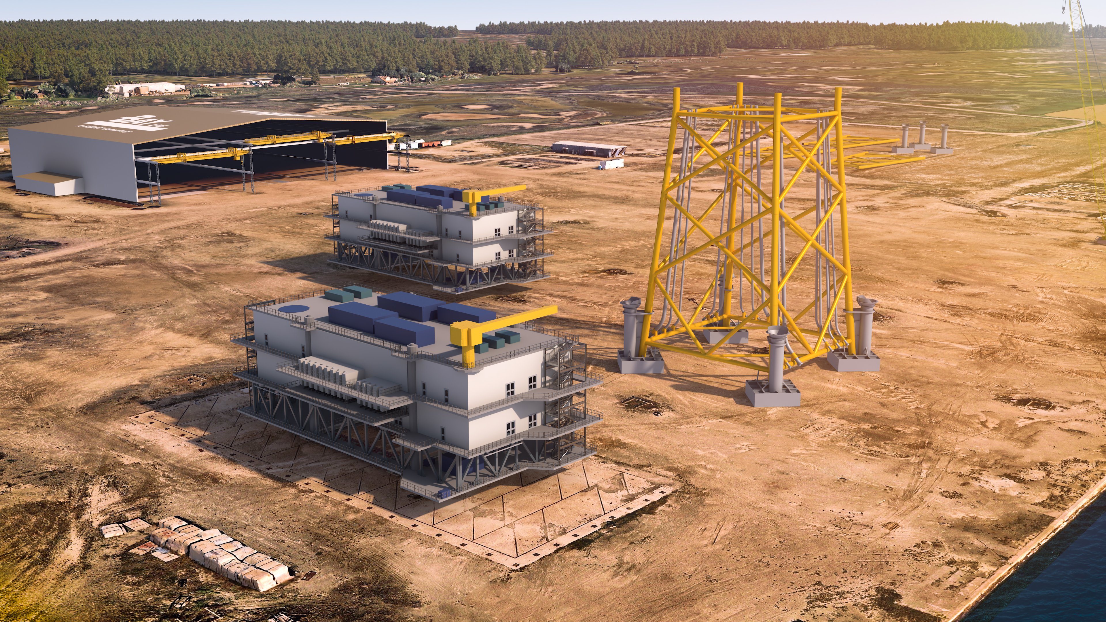 - Photo - Offshore substation rendering at Bay Ltd. fabrication yard in Corpus Christi, Texas