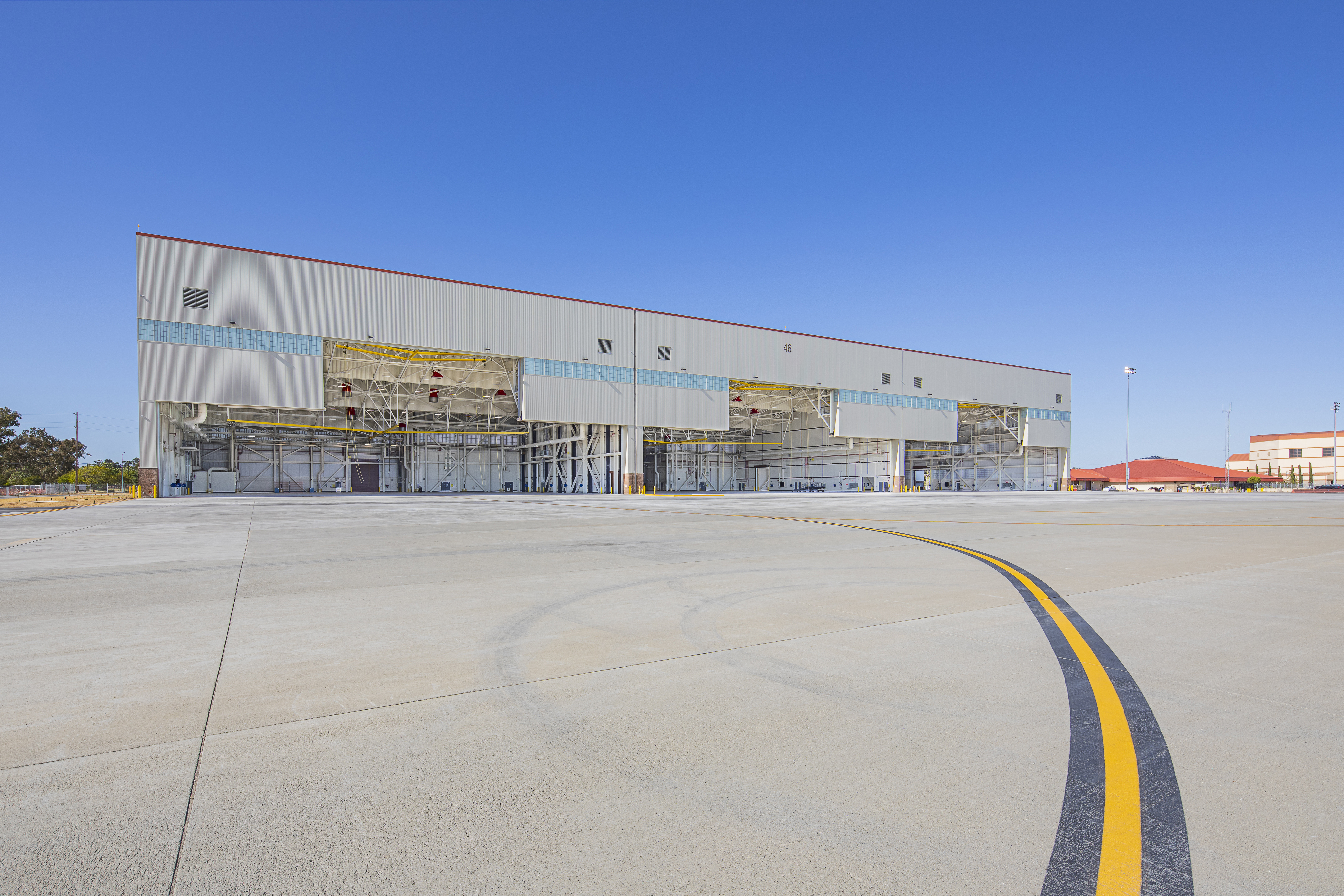 The three-bay maintenance hangar at Travis Air Force Base supports the KC-46A fleet, with designed flexibility to also accommodate KC-10 and C-17 aircraft. With 119,550 square-feet of hangar space and 57,750 square-feet of support space, the hangar includes shops for nitrogen, battery, hydraulic, testing, and oxygen systems, plus administrative areas and a breakroom. Burns & McDonnell provided complete design and construction support services for the project. The facility's sustainable design features translucent wall panels and fabric hangar doors for natural lighting, high-efficiency boilers, and economizers on air handling units for free cooling, all of which enhance energy efficiency. A 35-year life cycle cost analysis and detailed energy analysis identified energy savings of 47.5%.